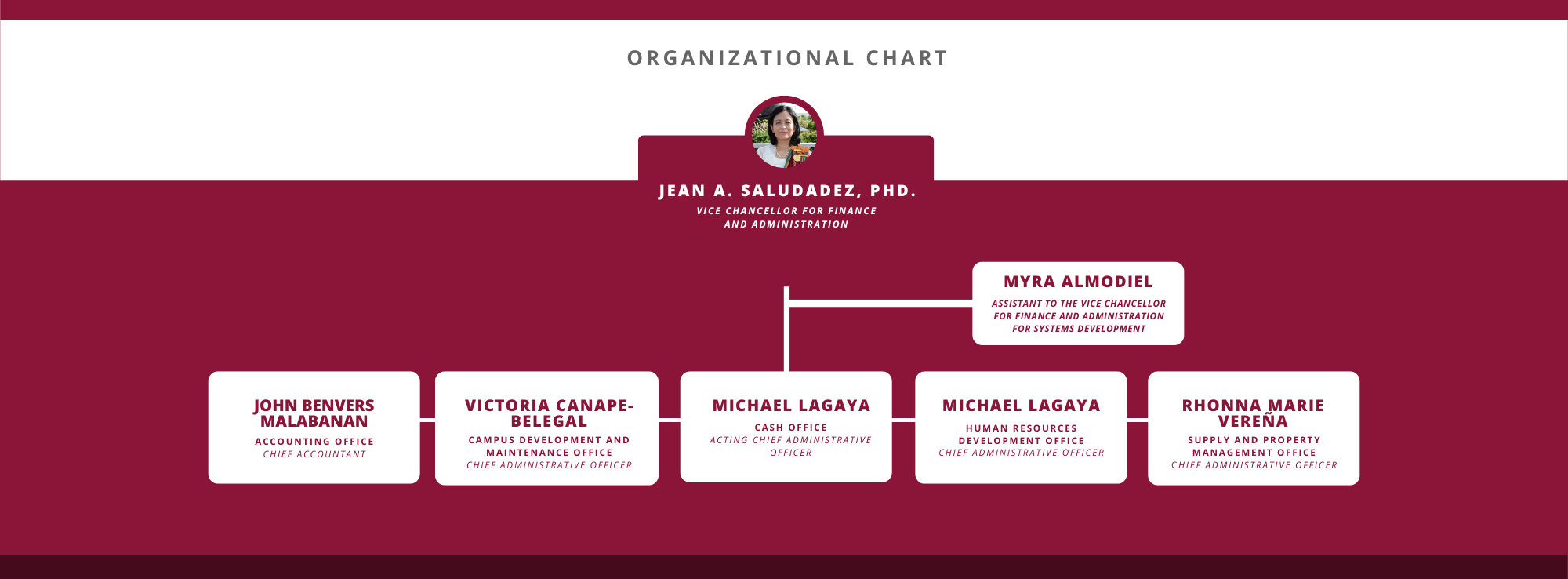 The Office of the Vice Chancellor for Finance and Administration (OVCFA) assists the Chancellor in the fiscal and administrative management and operations of the university. The Vice Chancellor, with the help of the five other heads of the different offices, provides quality service in order to promote an efficient, effective, and responsive university.